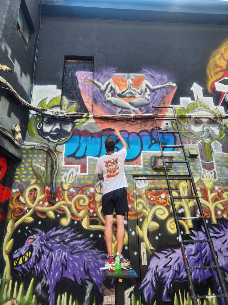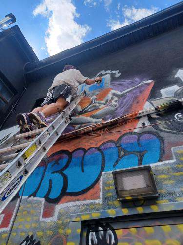 This is the first project of this type I have been a part of and it was a great learning experience in mural creation and using spray paint as a medium in a more serious context. Learning to work in large scale, how to manipulate light and shadow to create forms as well as wat it takes to be in the streets doing the art you love.